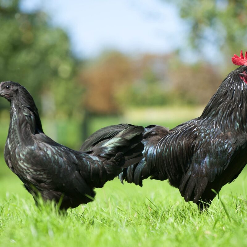 Contrairement à la Coucou de Rennes, la poule noire de Janzé est de petite taille. Elle a un plumage noir donc, avec quelques reflets verts. Elle est originaire de Janzé dans l’Ille-et-Vilaine. Si la race existe encore aujourd’hui, c’est grâce à L’écomusée de Rennes. En effet, la race est reconstituée au fil de croisements suite à un long travail de sélection en amont. Aujourd’hui, la race est connue pour être une prédatrice des frelons asiatiques et autres insectes nuisibles. En effet, la poule de Janzé est assez rustique et sauvage et n’hésite pas à voleter à droite et à gauche pour se nourrir.