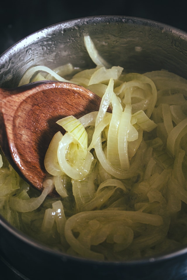 - Coupez l’oignon en fines lamelles et faites-le compoter avec les 60 grammes de beurre à feu doux. Le beurre doit fondre et l’oignon s’en imprégner.